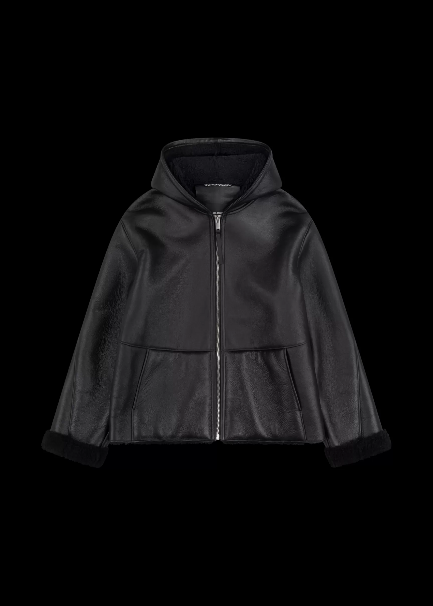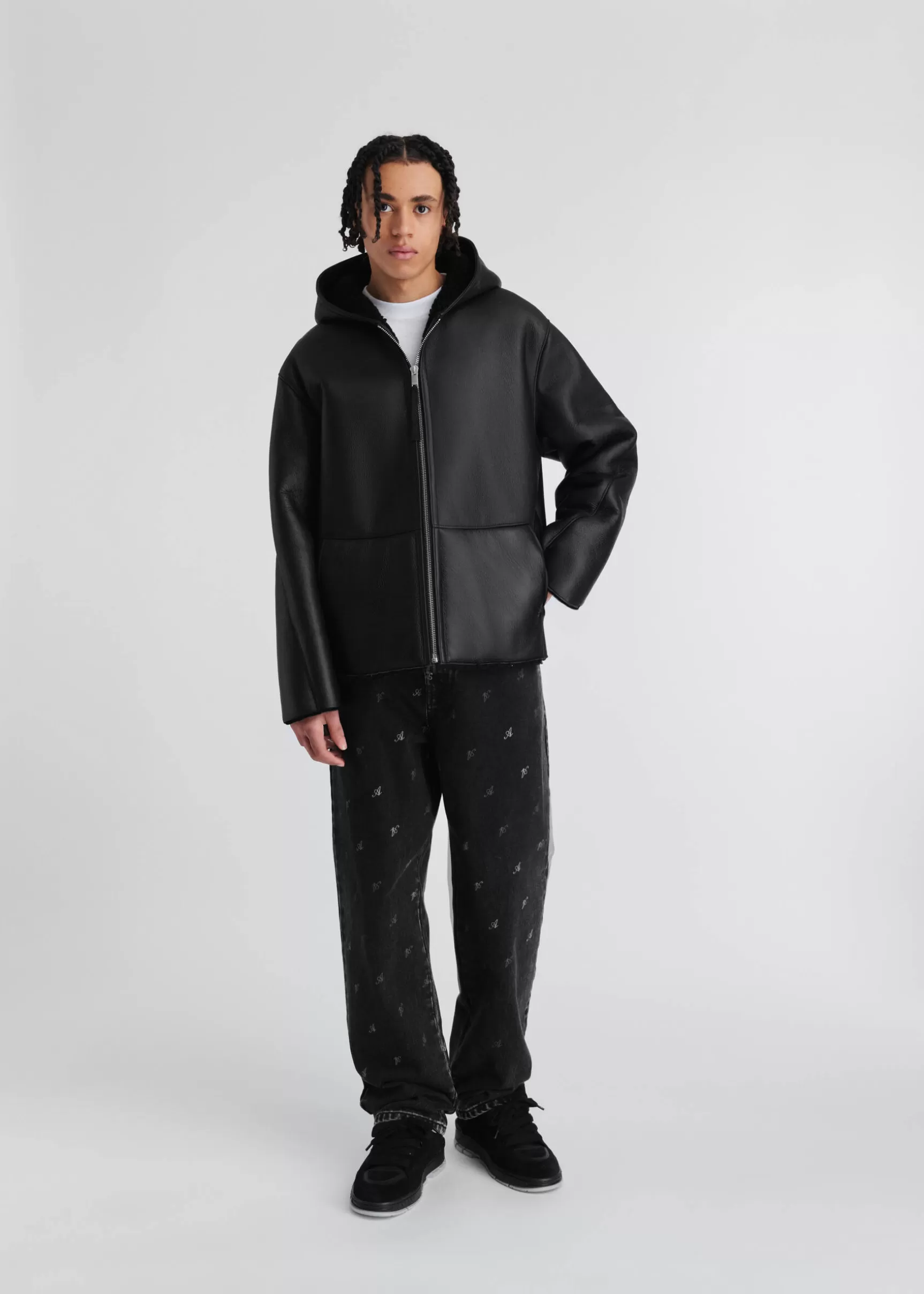 The hooded Angus jacket is crafted from soft, warm shearling in a relaxed silhouette. A branded leather patch details th…